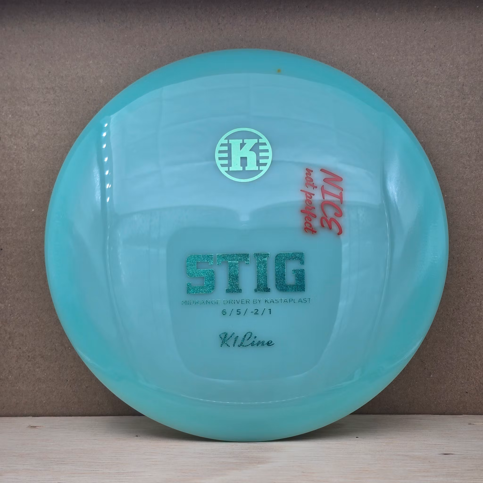 K1 First Run Stig X-Out - (N) 379 kr Available! Get in the bag! Information Mold: StigPlastic: K1Brand: KastaplastSpeed: 6 / Glide: 5 / Turn: -2 / Fade: 1Contition: New (N) – Never thrown but may have storage wearWeight: Marked 175gInk: No personal inkComment from us:The First Run Kastaplast Mint is something special!