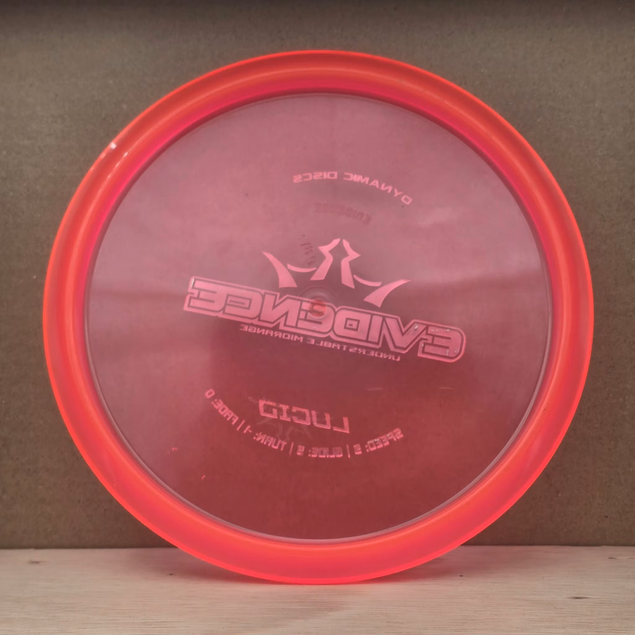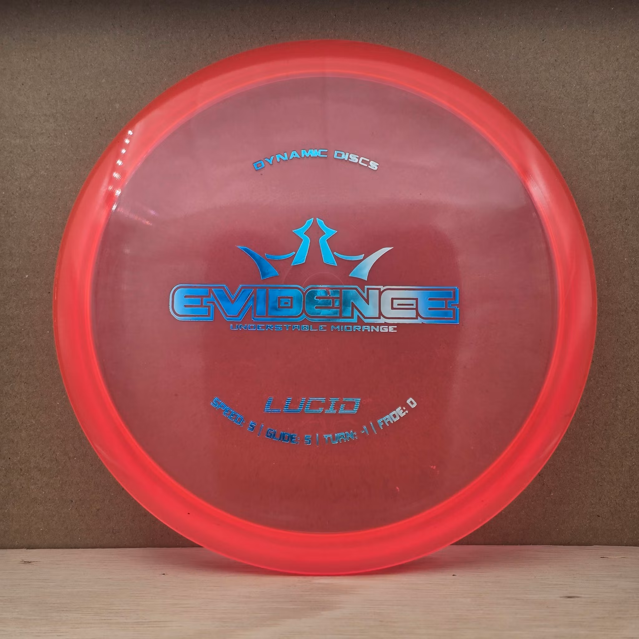 Lucid Evidence - (U) 129 kr Available! Get in the bag! Information Mold: EvidencePlastic: LucidBrand: Dynamic DiscsSpeed: 5 / Glide: 5 / Turn: -1 / Fade: 0Contition: Used (U) – Shows plenty of signs of use from many roundsWeight: Marked 178gInk: No personal inkComment from us:-