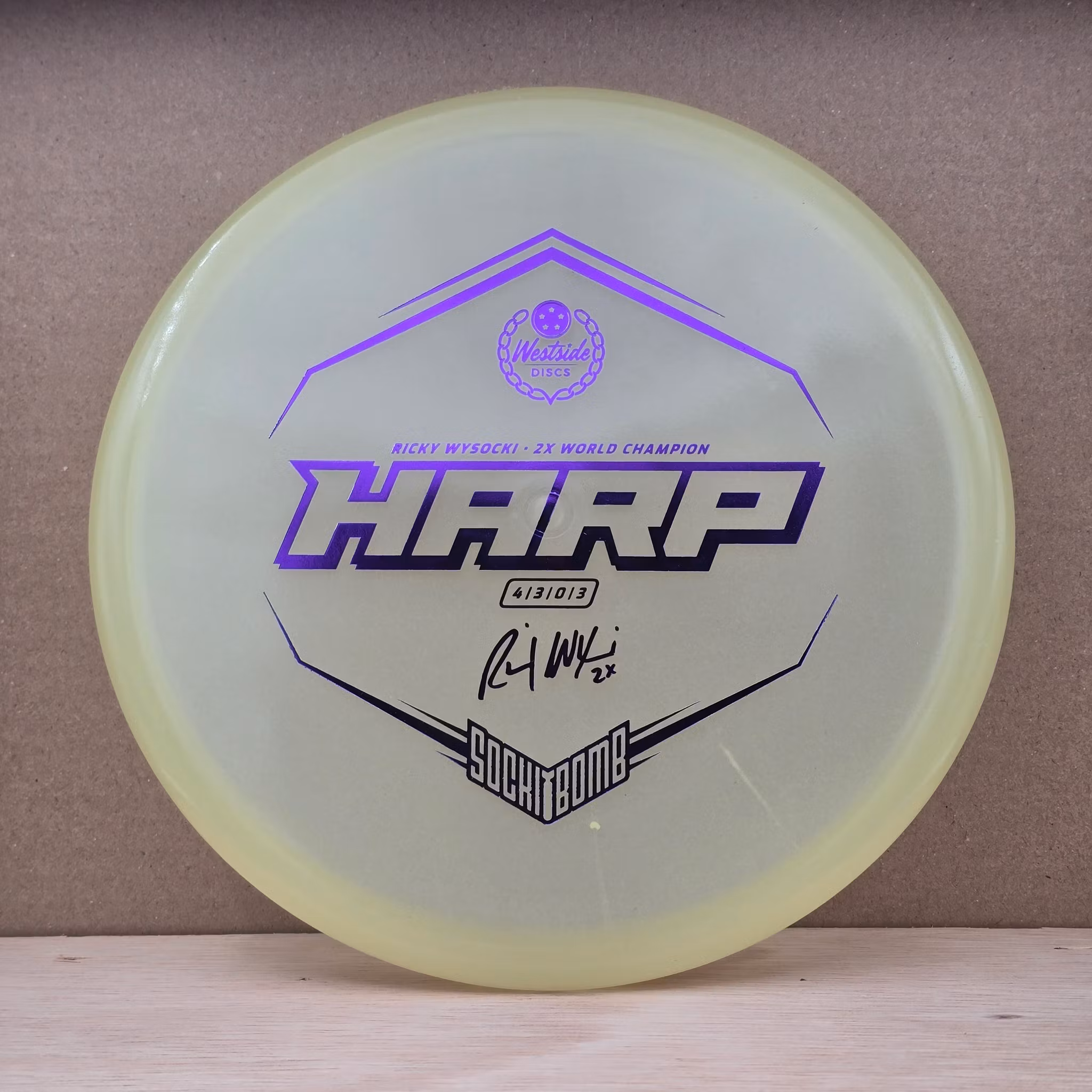 VIP Moonshine Harp Ricky Wysocki - (T) 239 kr Available! Get in the bag! Information Mold: HarpPlastic: VIP MoonshineBrand: WestsideSpeed: 4 / Glide: 3 / Turn: 0 / Fade: 3Contition: Tested (T) – Thrown a few times, very little wearWeight: Marked 174gInk: No personal inkComment from us:One of the best overstable 4-speed discs out there!